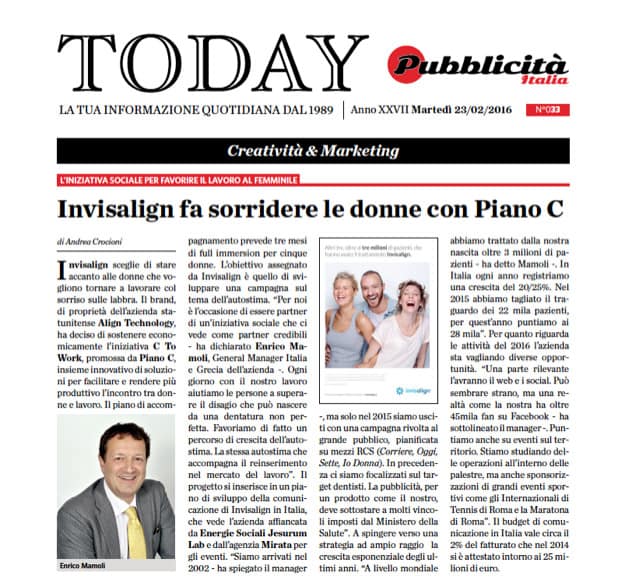 Invisalign ha sostenuto nel 2016 il percorso di cinque delle candidate che hanno preso parte a Piano C, un insieme innovativo di soluzioni per facilitare e rendere più produttivo l’incontro tra donne e lavoro.