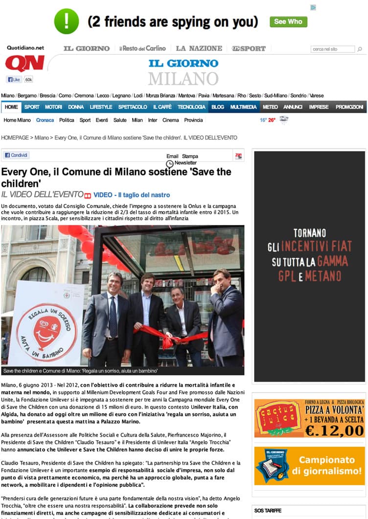 Conferenza stampa a Palazzo Marino a Milano alla presenza dell’allora Assessore alle Politiche Sociali Pierfrancesco Majorino, del Presidente di Unilever Italia, Vice Presidente Marketing Unilever, Presidente Save the Children Italia e Roberto Vecchioni, testimonial della campagna. All’esterno di Palazzo Marino, a seguire, un’azione poetica curata dal teatro Franco Parenti, diretto da Andrèe Ruth Shammah.